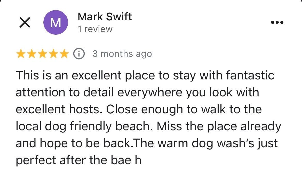 Excellent Quality Accommodation - High quality well equipped accommodation that is worth the price paid. Excellent communication from the owner who was very helpful and friendly. Also great for our two dogs who were catered for with just as much care as the rest of the family.