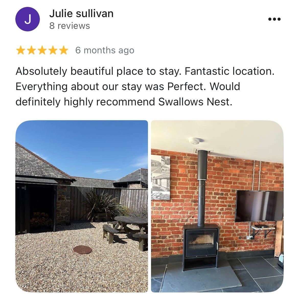 Wonderful accommodation, we’ve just really enjoyed our stay at Swallows nest. The quality of the accommodation is excellent. Enough room for us all with young children having space to play too.
