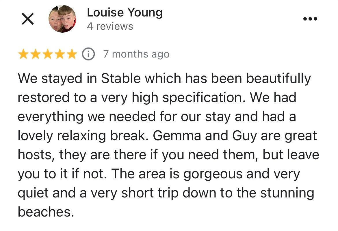 Had a fantastic stay at The Stable, Gemma has thought of everything the attention to detail was second to none.. lovey views, close to the beach.. I wish I could live there I will definitely be going back - Highly recommend