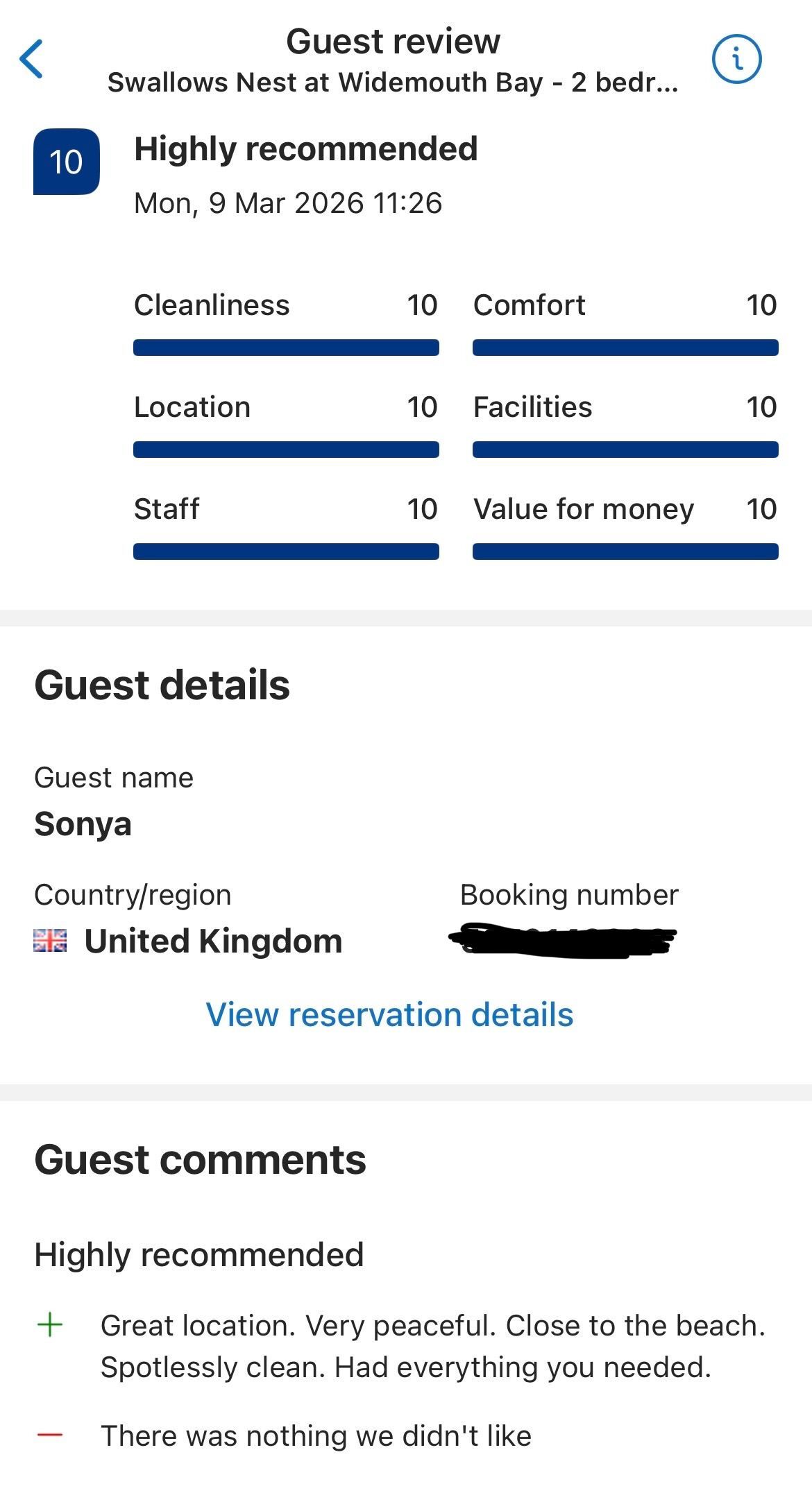 10 out of 10 (Booking.com - 2024 - Swallows Nest)